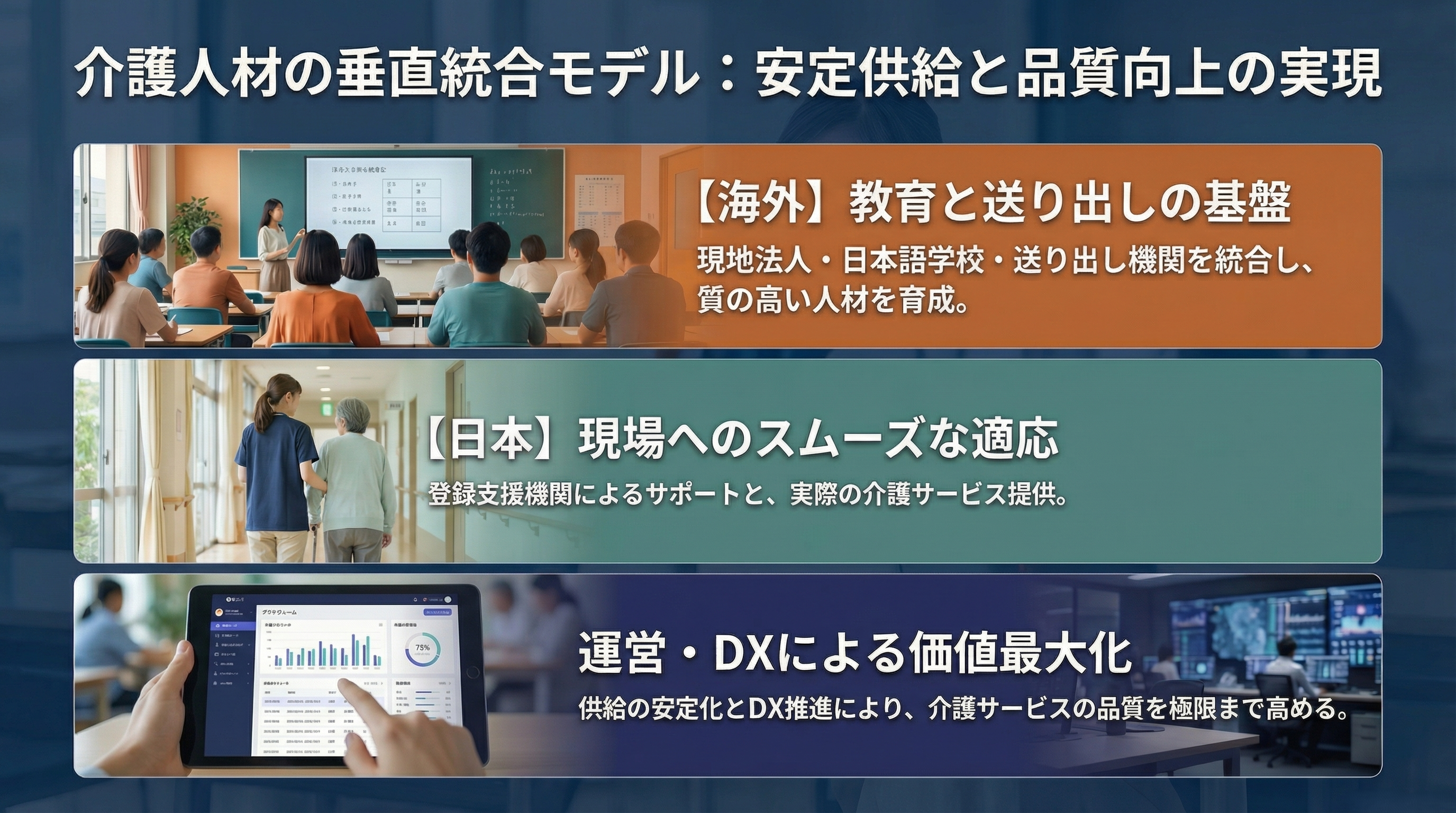 私たちは、現地法人、日本語学校、登録支援機関、介護サービスまでを一気通貫で担う“垂直統合モデル”を構築しています。
