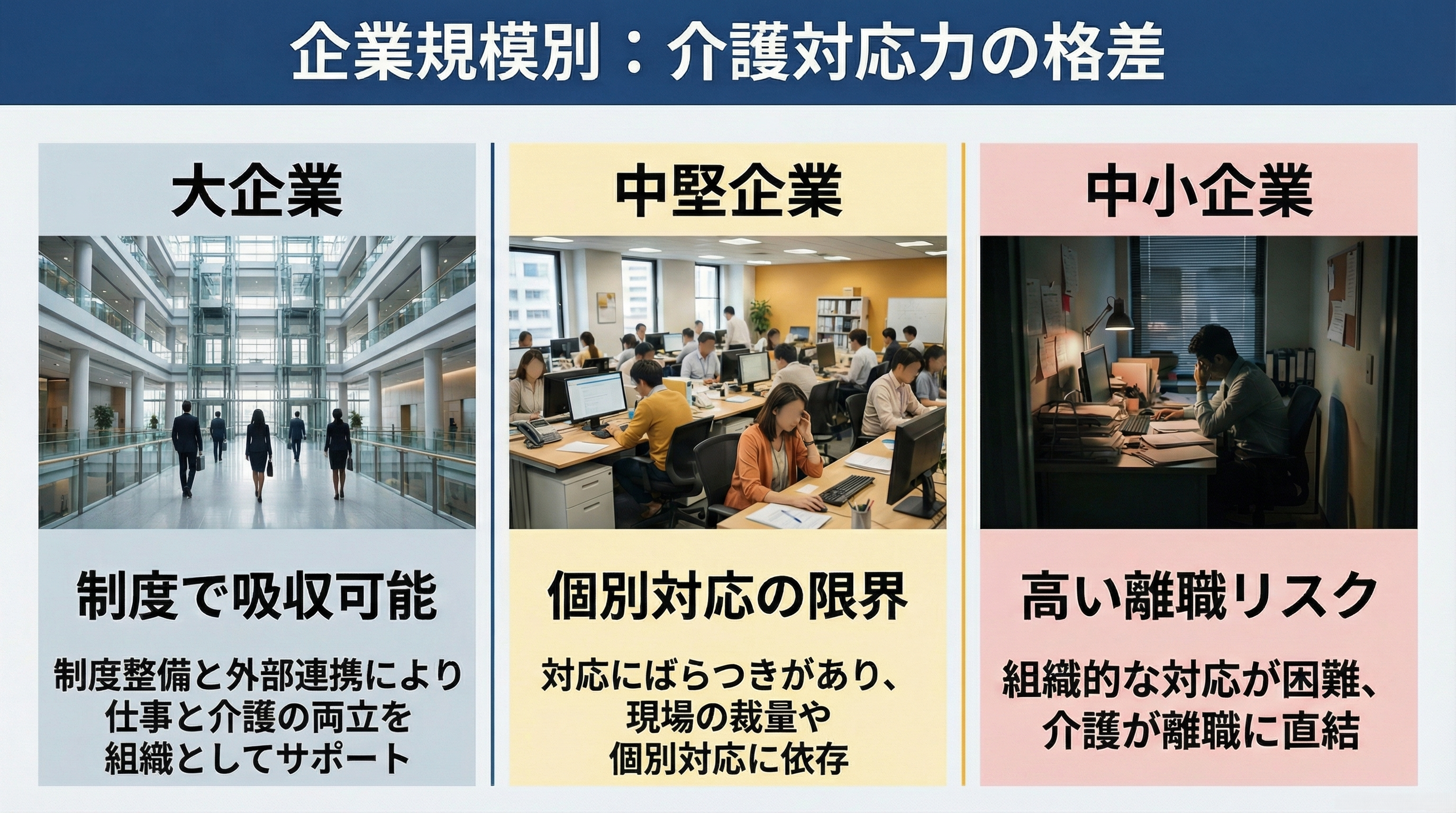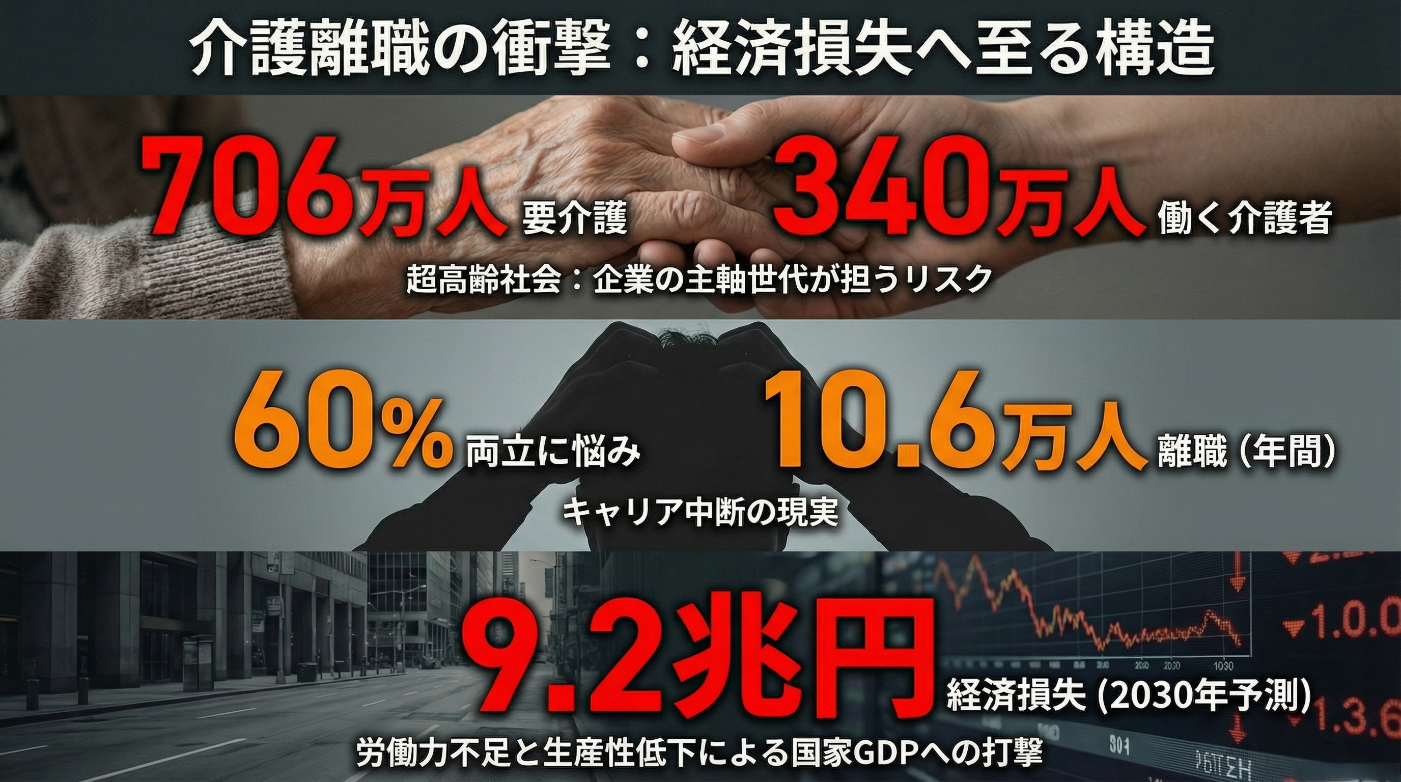 介護は突然やってくる。そして個人では解決できない。つまり、これは個人の問題ではなく、企業経営に直結する構造問題なのです。