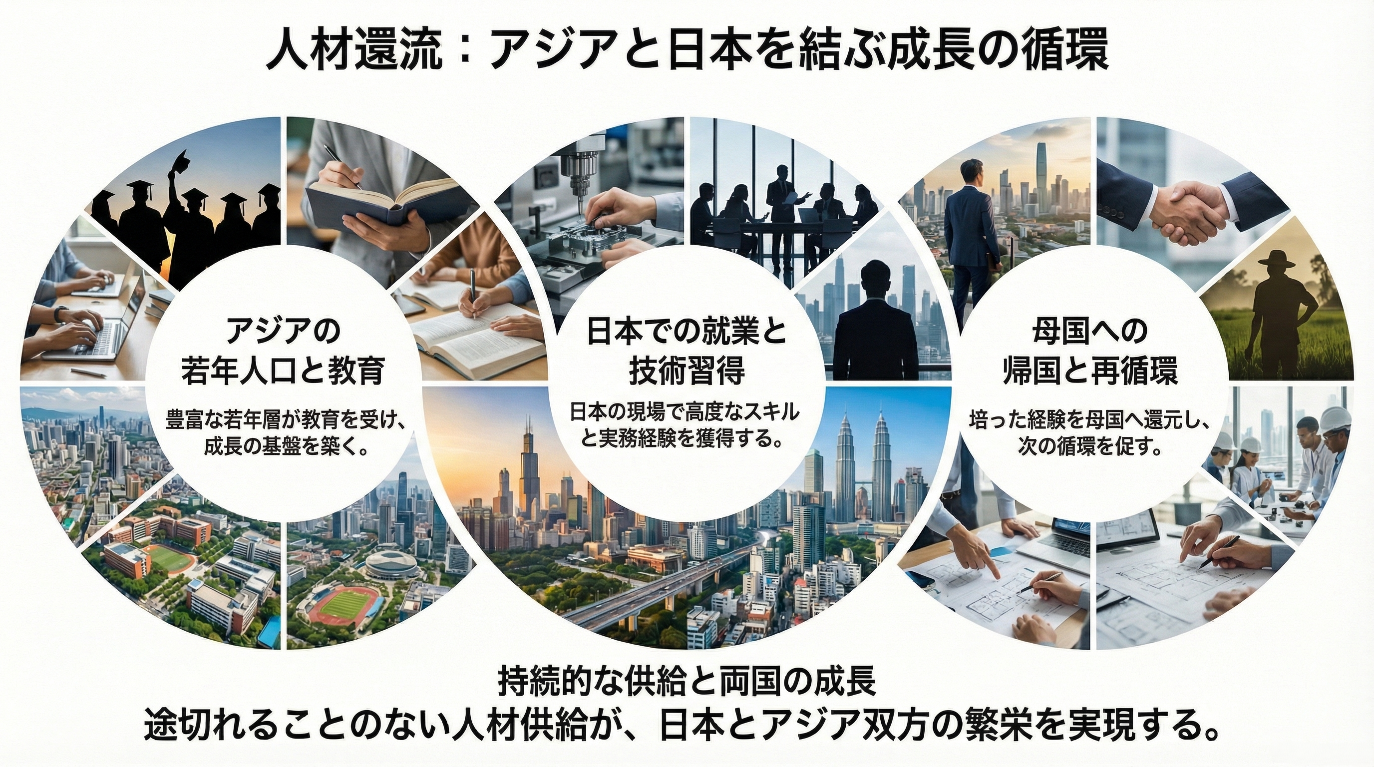 “人材還流”の仕組みです。アジアの若者が日本で働き、技能を身につけ、自国に戻って活躍する。そしてまた循環する。これは日本にとっては労働力の確保、送り出し国にとっては人材育成。